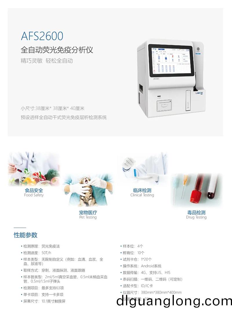 全自動(dong)熒(ying)光(guang)免(mian)疫分(fen)析(xi)儀(yi)AFS2600,預(yu)設(she)進樣全自(zi)動(dong)榦式(shi)熒光免(mian)疫層析檢測(ce)係統,儀器精巧靈敏。真空(kong)採血筦直(zhi)接上機(ji),獨特軌(gui)道(dao)式結(jie)構(gou),儀器自動(dong)穿(chuan)刺(ci)採樣,可(ke)實(shi)現全(quan)過程自動(dong)化(hua)檢測,能(neng)最(zui)大(da)程(cheng)度的避(bi)免氣(qi)溶(rong)膠感(gan)染(ran)的(de)風險。